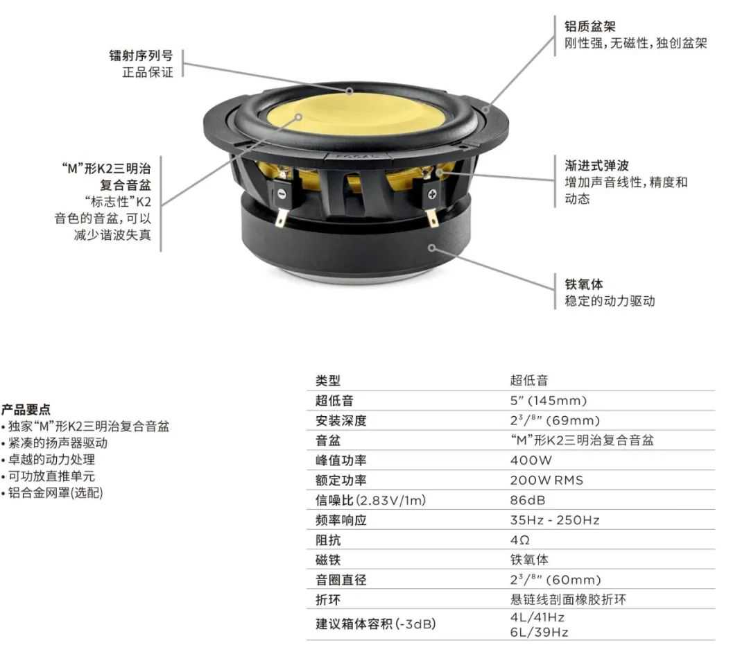 SUB5KM超低音同样搭配了“M”形K2三明治复合音盆,铝盆架+超大铁氧体,频率响应在35Hz-250Hz,体积小巧,但动力强大,量感十足,400W的峰值功率,建议箱体容积仅4L-6L,可以安装在车门或后备箱,玩法多样,安装便利。