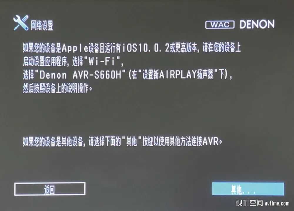 对于iPhoneiPad用户来说,可以通过手机Wi-Fi的设置页面,选取“AVR-S660H”,即可通过AirPlay快速联网