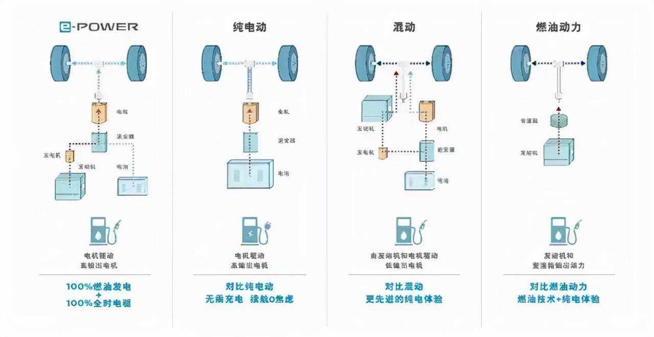 e-POWER系统工作原理为:汽油发动机仅作为输出动力源,不直接参与驱动车辆,而是为前置电机和锂电池供电,也可以理解为增程式电动汽车。