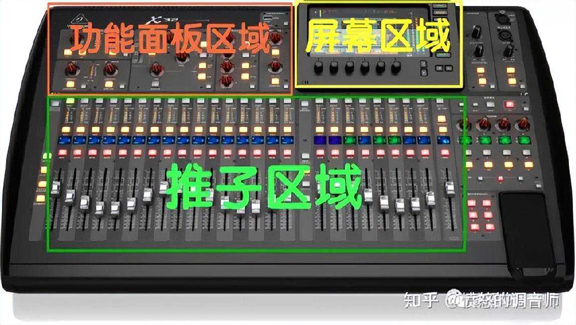 首先我们把数字台分成几个不同的区域,分别是功能面板区域,屏幕区域,还有推子区域。