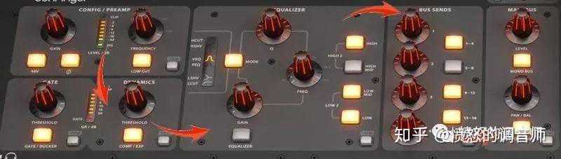 分别是增益模块,动态模块,eq模块,发送模块,主母线模块这几个模块。我们要用到的大部分音频处理功能都在这里了,而且很多参数都能用上面的旋钮和按钮来调整,所以很多调音操作都会在这里完成。