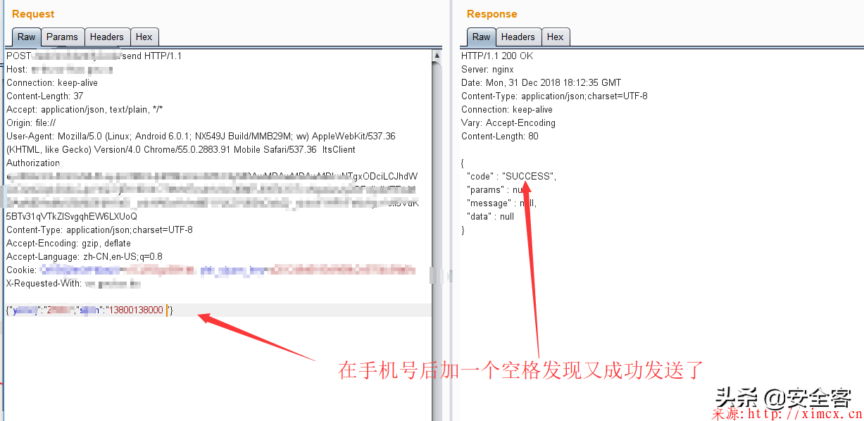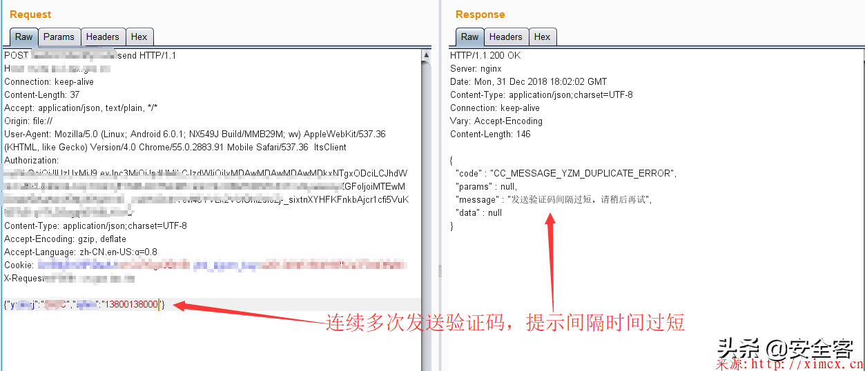 短信轰炸,一般人可能抓包重放失败后就放弃了。这里有个技巧,