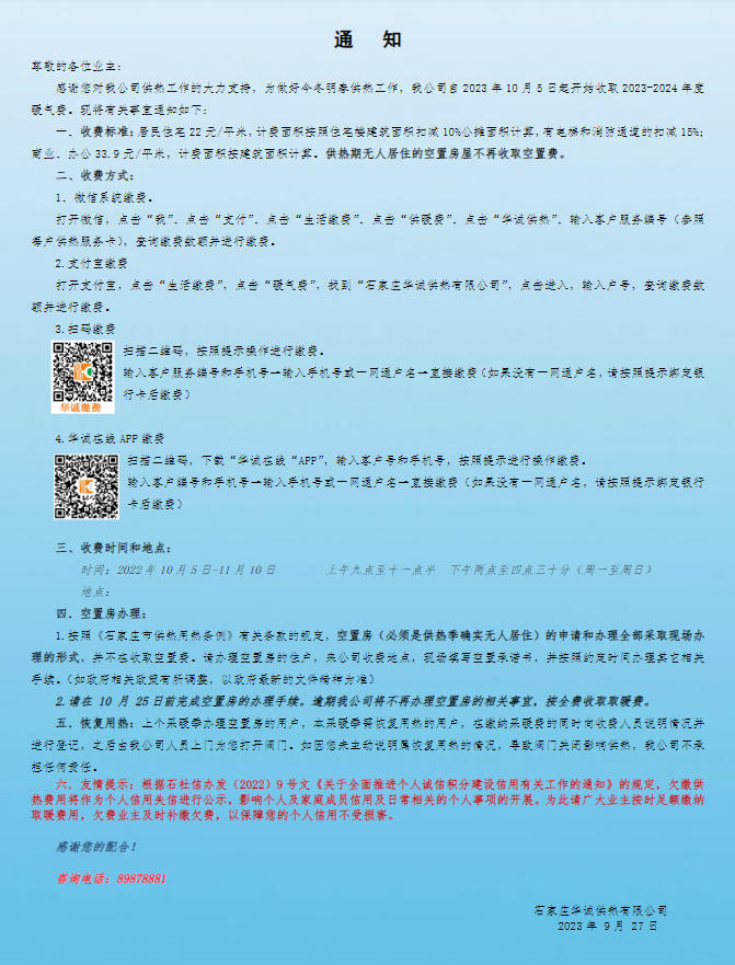 热费缴纳时间:9月16日~10月31日,营业时间8:30~17:30,节假日不休息。