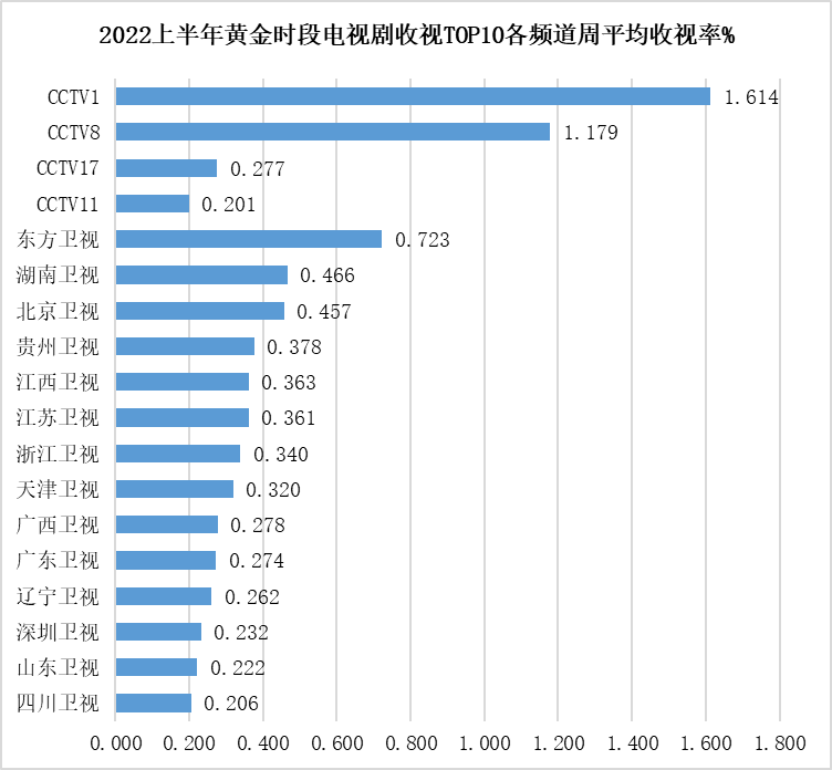 就收视率表现来看:2022上半年,CCTV1黄金时段电视剧周平均收视率最高,为1.614%;CCTV8黄金时段电视剧周平均收视率也在1%以上(1.179%);省级卫视黄金时段电视剧周平均收视率分层明显,东方卫视以0.723%领先;其次是湖南卫视、北京卫视,介于0.45%-0.5%之间;贵州卫视、江西卫视、江苏卫视、浙江卫视、天津卫视介于0.3%-0.4%之间;其余6个上榜频道介于0.2%-0.3%之间。