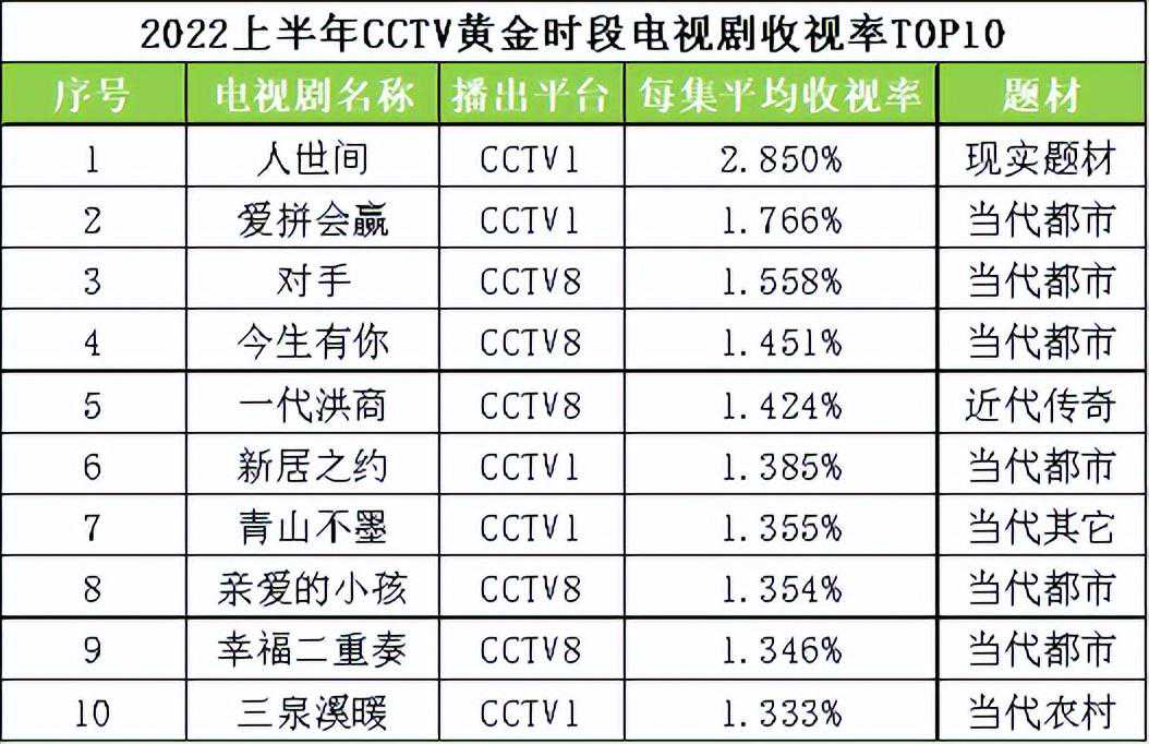 综观2022上半年CCTV黄金时段电视剧收视率TOP10,CCTV1和CCTV8平分秋色,各有5部上榜。其中,CCTV1播出的现实题材剧《人世间》以2.850%的每集平均收视率绝对领先。就题材来看,CCTV1上榜剧目题材类型较为多元,现实主义、当代都市、当代其它、当代农村等均有涉及,扛剧实力毋庸置疑;相较而言,CCTV8上榜剧目集中在当代都市剧,除《一代洪商》为近代传奇剧外,其余均为当代都市剧。