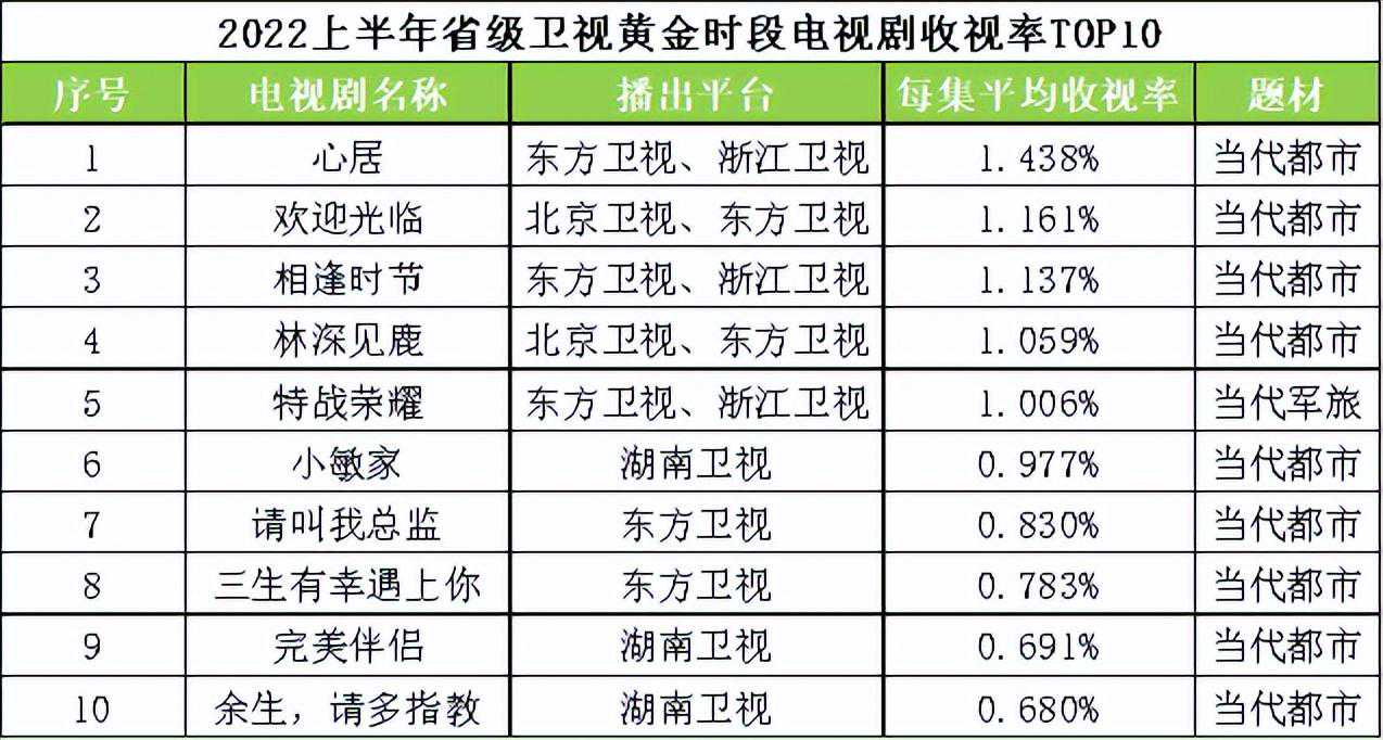 综观2022上半年省级卫视黄金时段电视剧收视率TOP10,东方卫视风头强劲,有7部剧上榜,其中与浙江卫视联播的《心居》《相逢时节》《特战荣耀》、与北京卫视联播的《欢迎光临》《林深见鹿》,每集平均收视率均在1%以上,位列前五;此外,东方卫视独播的《请叫我总监》(0.830%)、《三生有幸遇上你》(0.783%)亦榜上有名;湖南卫视3部独播剧上榜,分别为《小敏家》《完美伴侣》《余生,请多指教》。