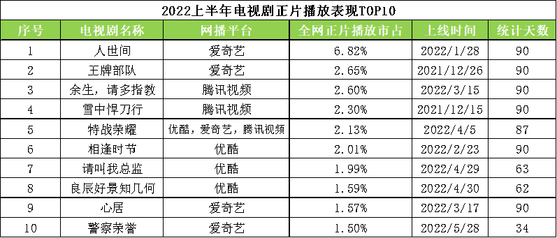 作为网络播出平台,2022上半年爱奇艺降本增效成效显著,全网独播的5部电视剧《警察荣誉》《人世间》《风起陇西》《对手》《亲爱的小孩》均跻身前列,收获良好的网络口碑。