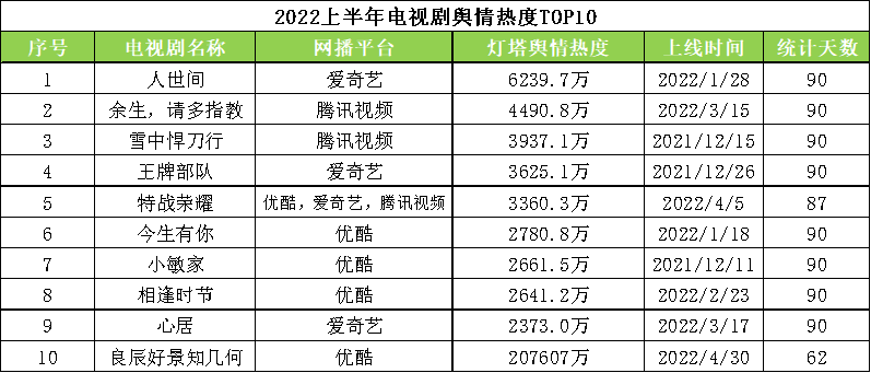 统计范围:统计2022/1/1-2022/6/30在播剧集上线后90天内的累计舆情热度。
