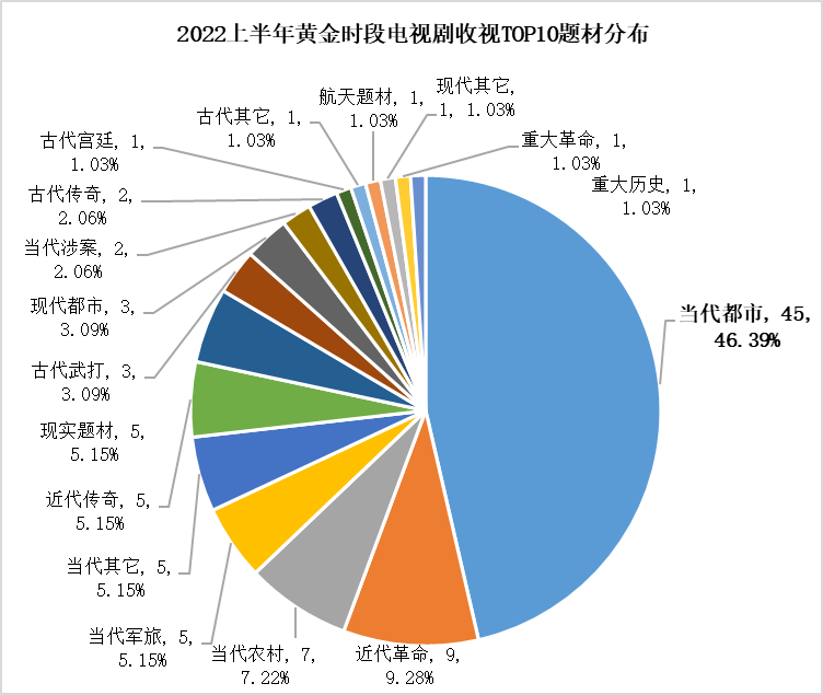 2022上半年,以当代都市剧为代表的现实主义题材剧是电视剧播出的主流。从上榜中国视听大数据(CVB)每周黄金时段电视剧收视情况TOP10的97部剧的题材分布来看,当代都市题材有45部,占比46.39%,其次,近代革命、当代农村、当代军旅、近代传奇等题材也有一定比例分布。