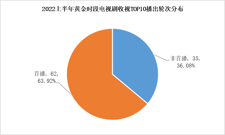 2022上半年上榜的97部剧中,首播剧有62部,占比63.92%,非首播剧有35部,占比36.08%,上榜首播剧与非首播剧近“六四开”比例分布。其中,首播剧主要集中在CCTV1、CCTV8及东方卫视、湖南卫视、北京卫视、浙江卫视、江苏卫视五大一线卫视播出。