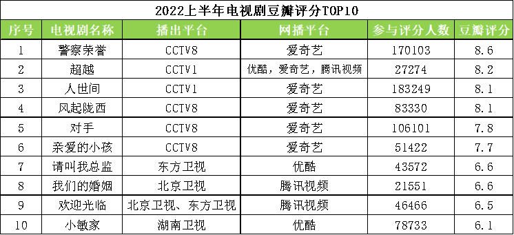 综观2022上半年电视剧豆瓣评分TOP10,入围电视剧豆瓣评分均在6分以上。CCTV播出剧目品质高,共计入围6部,囊括总榜前六,评分均在7.5以上,其中,CCTV8播出的《警察荣誉》《风起陇西》、CCTV1播出的《人世间》《超越》豆瓣评分均在8分以上,《人世间》《警察荣誉》《风起陇西》参与评分人数均超过10万人。