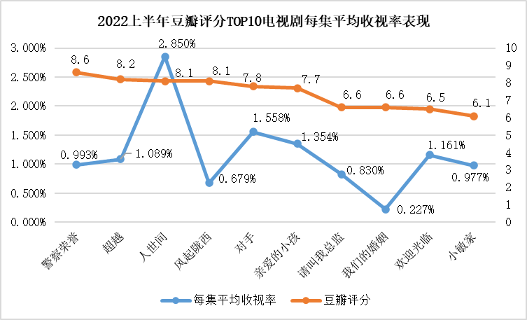 总体来看,电视大屏的收视表现与网络口碑并不成正比。除《人世间》收获高收视率和高口碑外,豆瓣评分超过8分的两部剧《警察荣誉》(8.6)、《风起陇西》(8.1)电视端每集平均收视率分别为0.993%、0.679%,均未破1%,其中《风起陇西》甚至在CCTV8上半年播出剧目中收视率垫底,电视端与网络端形成明显的圈层壁垒。