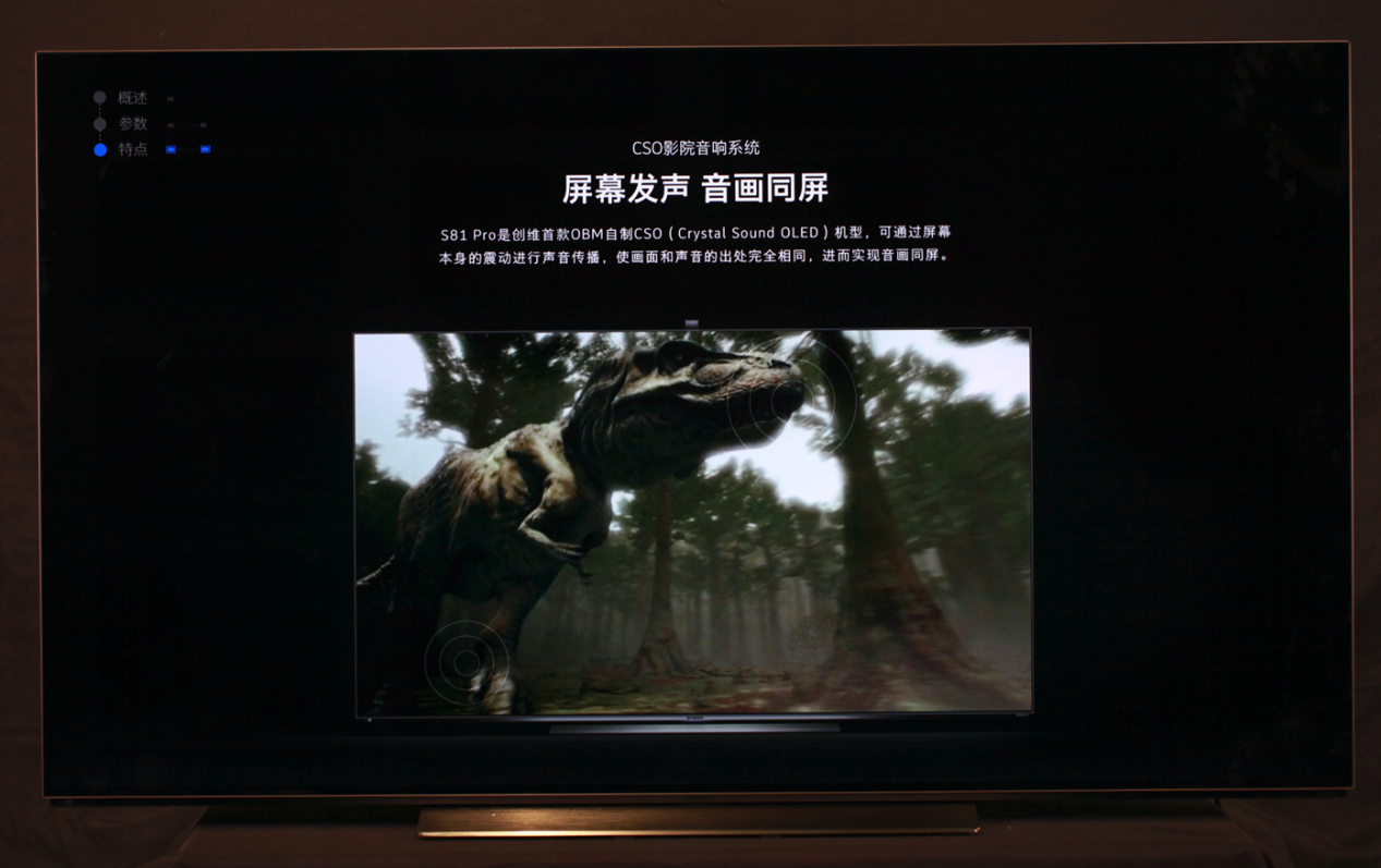 创维不同于其他国产OLED电视品牌最明显区别之一就是创维是有OBM自制CSO能力的厂家,从实际听感来看,创维S81Pro的屏幕发声音响系统表现也是完全达到了中高端回音壁的水准,不仅能量澎湃而且得益于屏幕发声的方式让声音定位更精准。