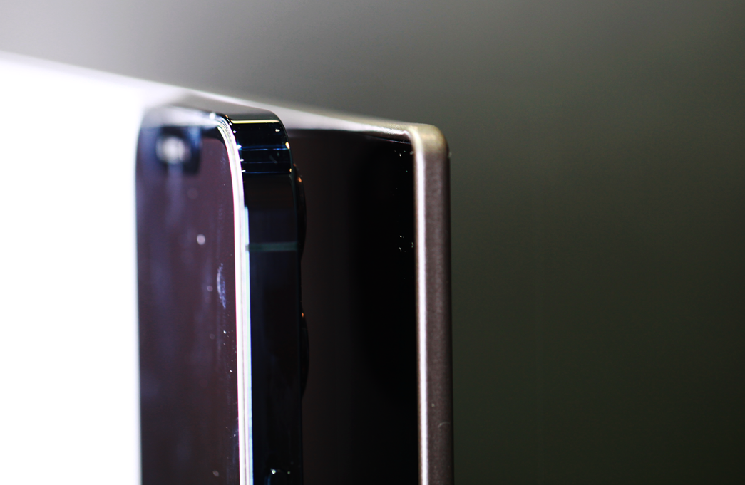 创维S81Pro屏幕也薄的让人感觉惊艳,和iPhone12手机相比厚度来看更体现出美感(左为手机右侧为创维S81Pro)