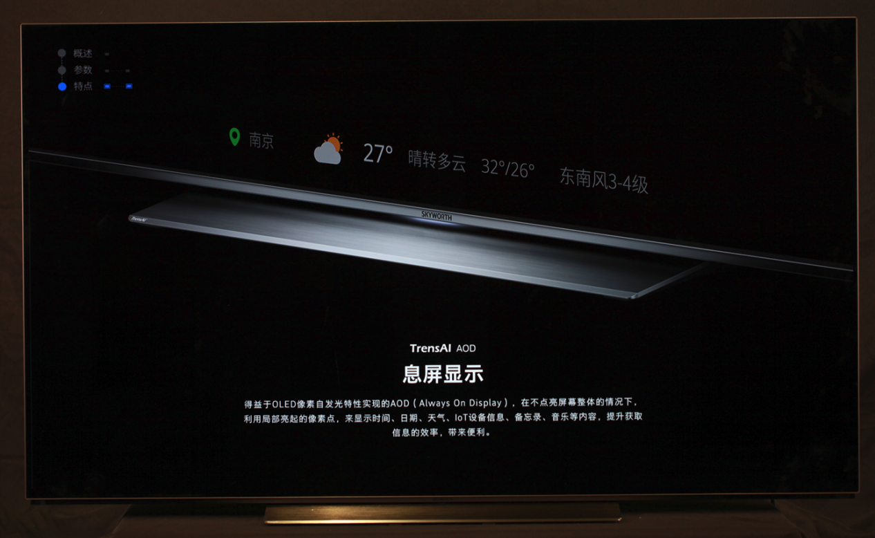 还有很神奇的一点是:不同于传统液晶电视的显示方式,创维S81Pro利用OLED自发光的特性,而创意的设计出了TrensAIAOD,可以在不点亮屏幕整体的情况下,显示出一些时间天气或者音乐信息等内容。