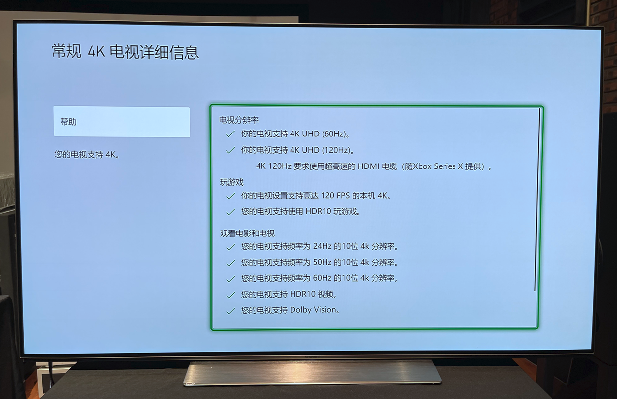 而由于PS5目前索尼还没给开放VRR等功能,所以我们再来说XSX上的识别信息,开机后XSX识别到电视支持高级功能提示可以开启