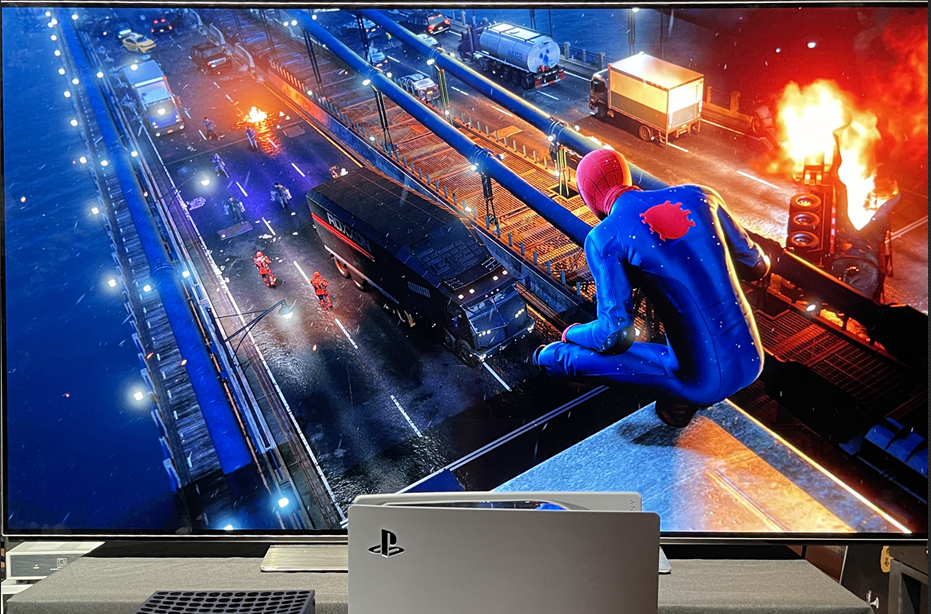 从实际画面效果来看,创维采用的OLED屏幕可以完美的解析出4KHDR的每一个像素细节,在PS5游戏《蜘蛛侠》中人物面部表情细腻,甚至皮肤肌肉和毛孔都清晰可见。
