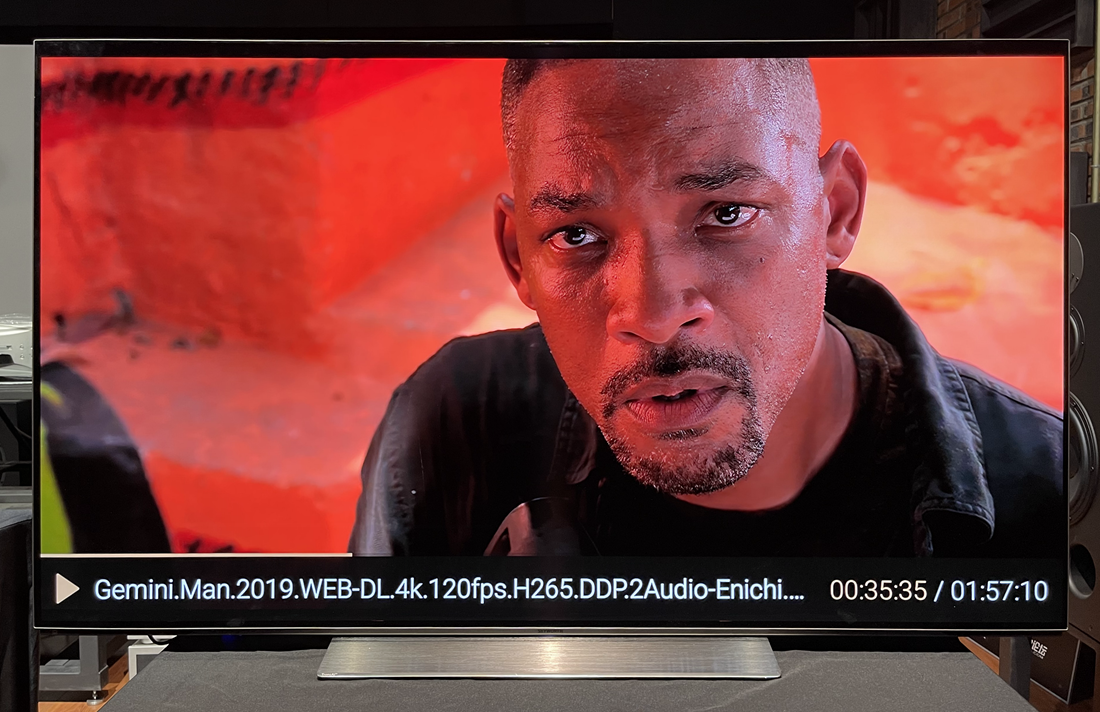 我们试了一下双子杀手的4K120版本,画面比普通的30帧蓝光版和60帧的4KUHD版本都更加顺滑,跟同事一起观看后有一个同样的感受就是似乎画面里的人物更加真实了,临场感更加明显,就跟高帧率电影院里的画面感受非常类似。这部影片目前也没有播放器可以进行播放,在外贸盒子S905X3上虽然可以正常解码但是也只能4K60输出,在创维电视的内置播放器上做到了完美的120帧解码播放。