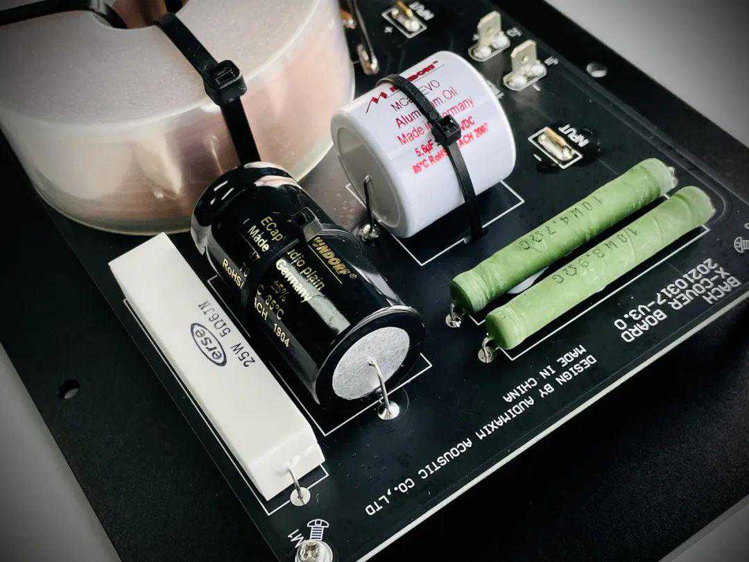 由于单元与号角的失真都很低,BACH音箱的分音器只用最简单的一阶分音,总共只有6个组件,包括14AWG高纯度无氧铜制作的铜箔电感、西门子银云母积层电容(低音用),以及德国Mundorf的铝油浸电容、ERSE25W线绕无感分频器专用电阻(高音用)。内部接线均为4N无氧铜,喇叭接线座则是WBTNextgen产品