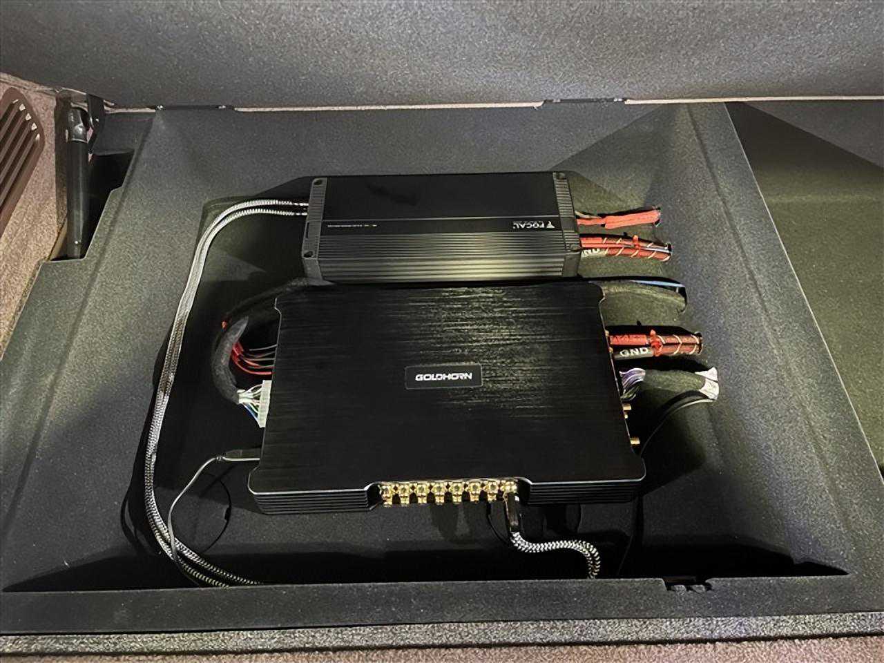 歌航R316DSP功放与劲浪单路功放接线隐藏安装在尾箱凹槽处