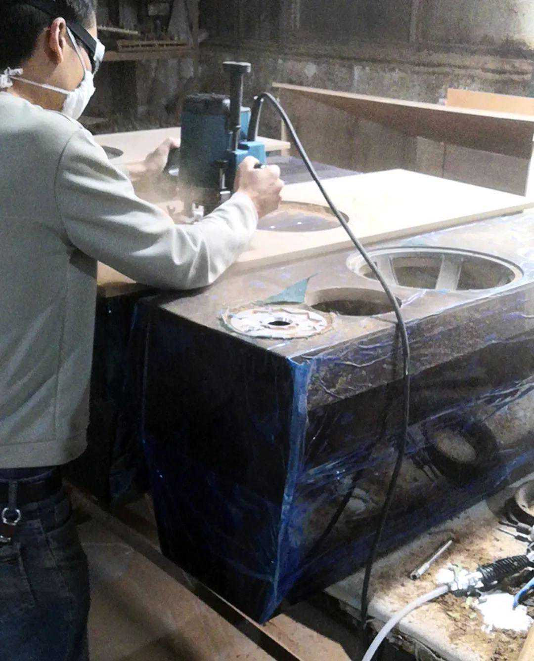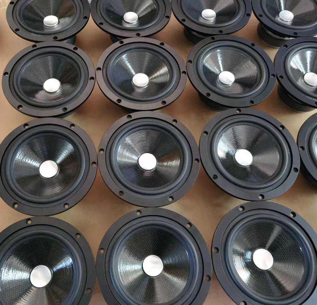 美国进口的编织碳纤维冲压成锥盘,再以轻量泡沫材料为夹层提供适当的阻尼,制作成三文治碳纤维中低音振膜