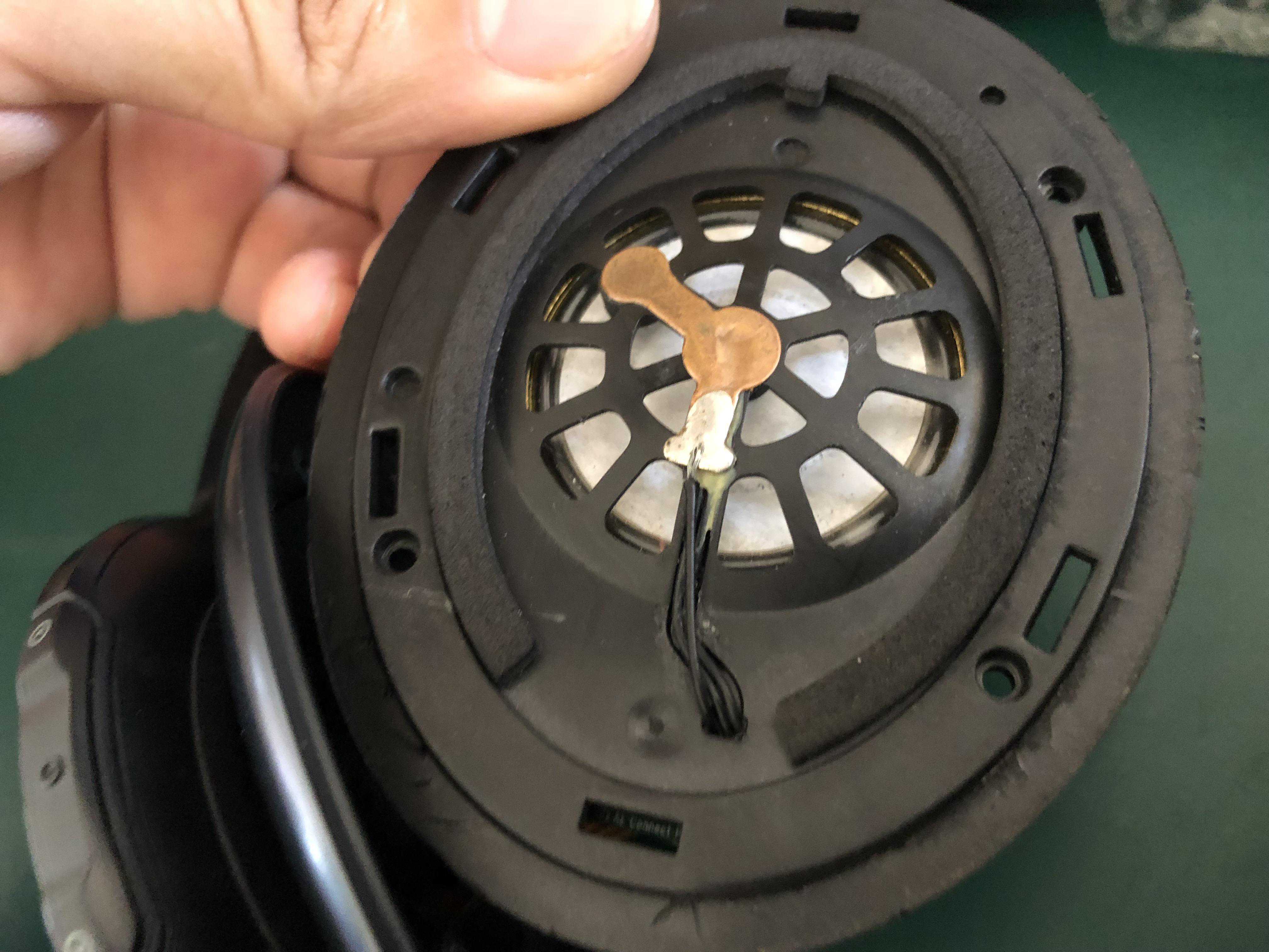 解胶后,分离振膜和支架,发现音圈线就断在铜环位置,引线走线是9型的,对重新引线不担心了,剩下的长度足够;这个支架磁路部分,和上次拆的solo3大小类似,看起来调音阻尼不同,也许磁力级别也不同,磁力不会被环境轻易改变就不检测了