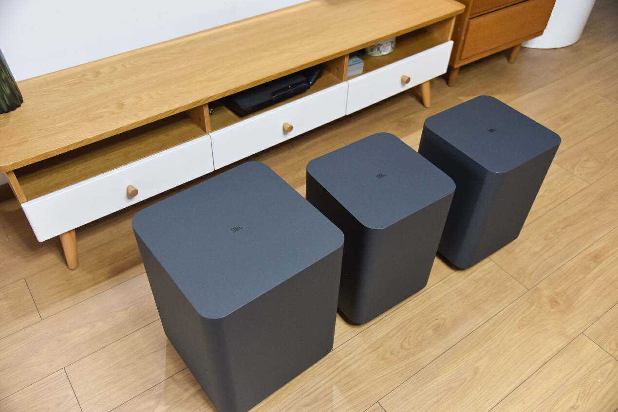 从外观来看,我用过的所有JBL家庭影院的低音炮的外观设计基本都是一致的,相对更加低调典雅,深空灰色很有质感。这样一对比,三款家庭影院的低音炮的区别马上就出来了。