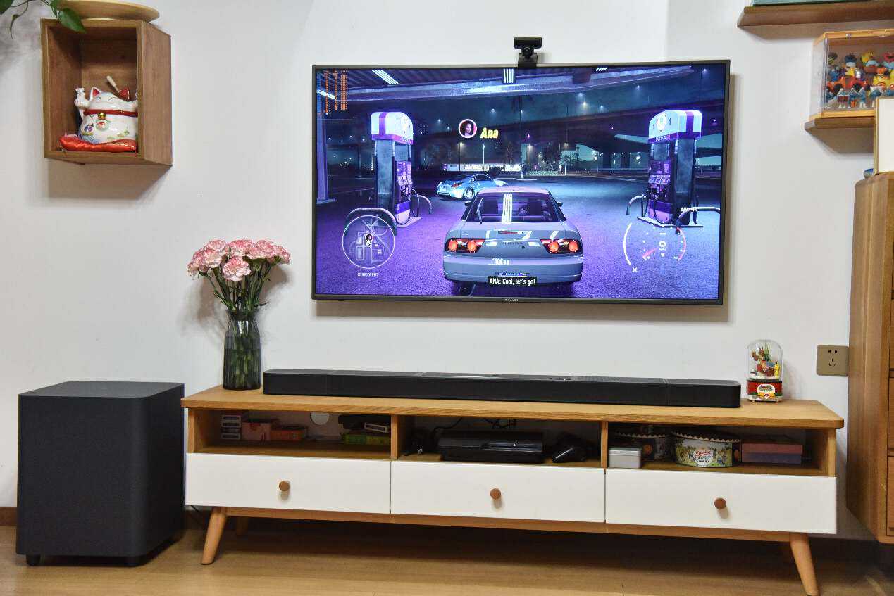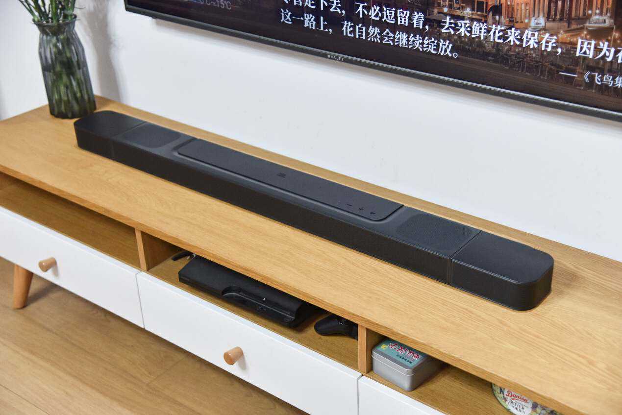 把这台JBLBAR1300X摆放在我家55寸的电视下方,我感觉我家电视真的有点高攀的意思,这配置妥妥要75寸电视才能驾驭啊。