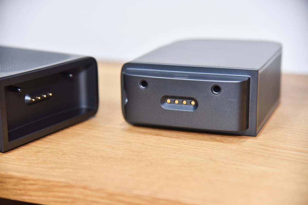 在回音壁与环绕扬声器的连接上,JBLBAR800和JBLBAR1000都是采用的设置,采用顶针式的接口以便更好地连接,并为环绕扬声器进行充电。