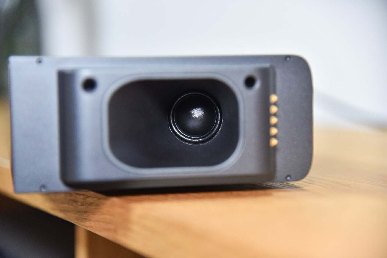 取下JBLBAR1300X的环绕扬声器,我们会发现完全不一样的设计,不同于另外两款设备的4触点设计,JBLBAR1300X更多的发声需要更多的触点,并且5个触点被设计在了背部一侧。