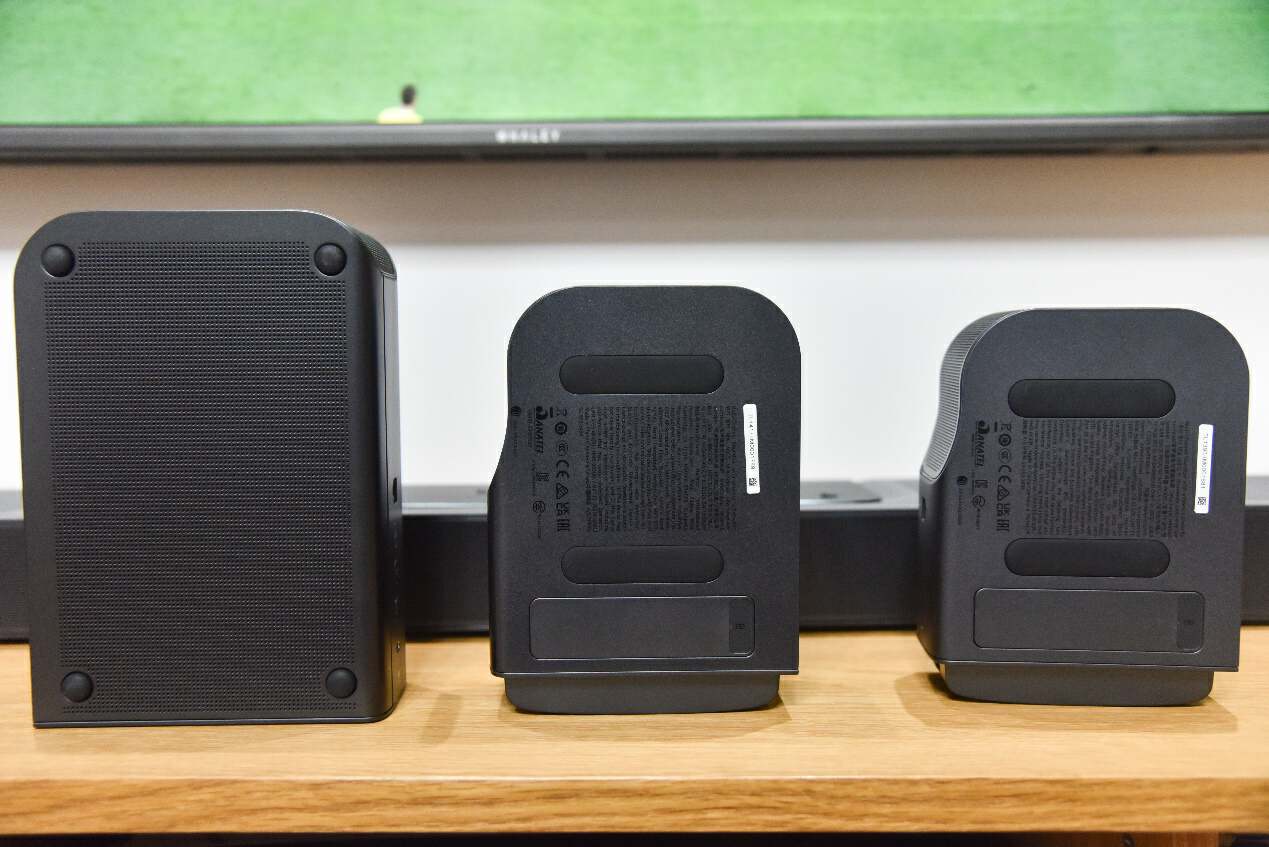 作为沉浸式家庭影院体验中非常重要的一个部分,环绕扬声器的作用是无法忽视的,如何帮助发挥客厅里惊艳的全景声效果,环绕扬声器能够起到画龙点睛的作用。从三款家庭影院的环绕扬声器的尺寸对比来看,JBLBAR1300X显然更大,另外两款虽然有区别,但是尺寸出入不大。