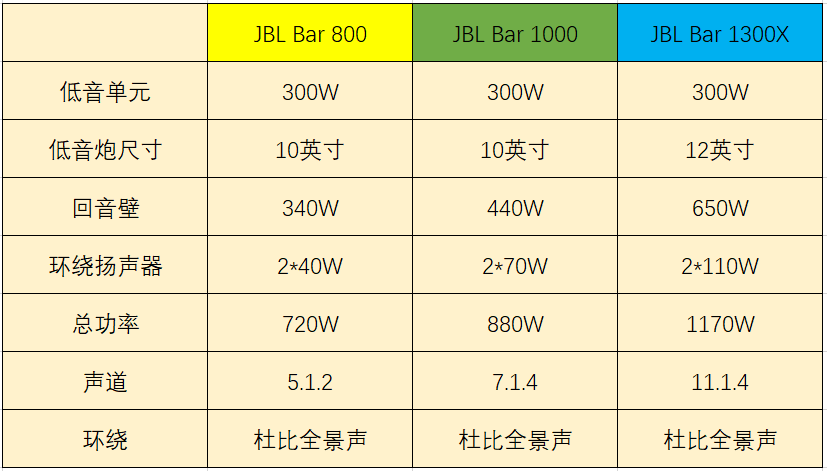 看完这些主要的参数和配置之后,我专门制作了一个表格,从表格中,我们就能非常直观地看到JBL三款家庭影院在主要硬件参数方面的区别。