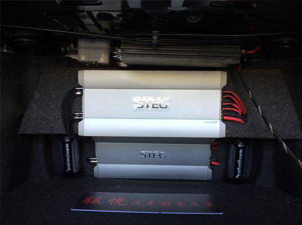 功率放大器和电容全部安装在车尾箱,整齐摆放,减少占用空间,不影响车主摆放私人物品。意大利史泰格K系列功放,一台四路K402推动丹拿342高音和中音,一台两路K203推动中低音玩主动分音,两只来福电容保证电流供给,音色准确自然,能量充沛,即使是在大动态下依然游刃有余。