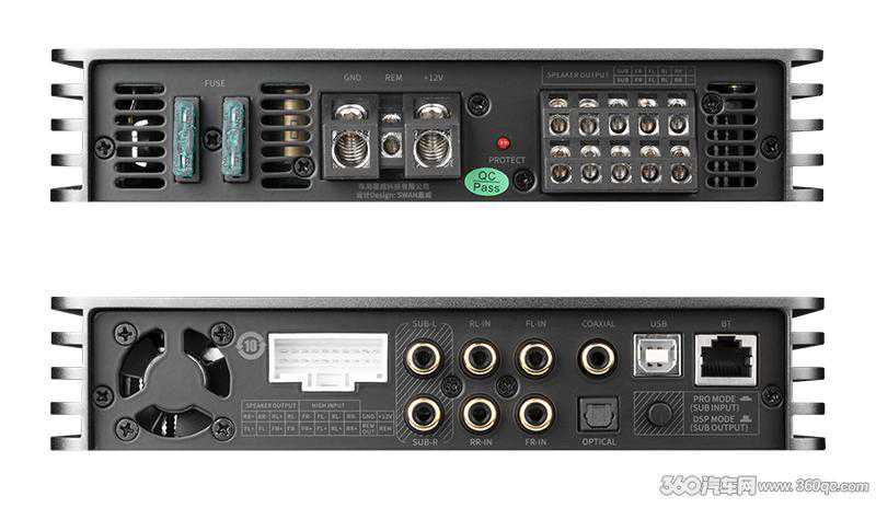 惠威PXA系列三款DSP功放产品,外观造型和尺寸都是一样的。四四方方的设计很简洁,196×184×39mm的精小尺寸,可以隐藏式安装在座椅底下,并且不会留下改装痕迹。虽然体积小,但看到产品的各种设计之后,你会发现在机器小小的躯壳内,有着强大的能量输出。接线端口分设前后两侧面,支持高电平、RCA、同轴、光纤等音频信号传输模式,还可外接蓝牙模块支持Aptx高清蓝牙音频,以及手机APP进行操控调音,让使用过程更加便捷。