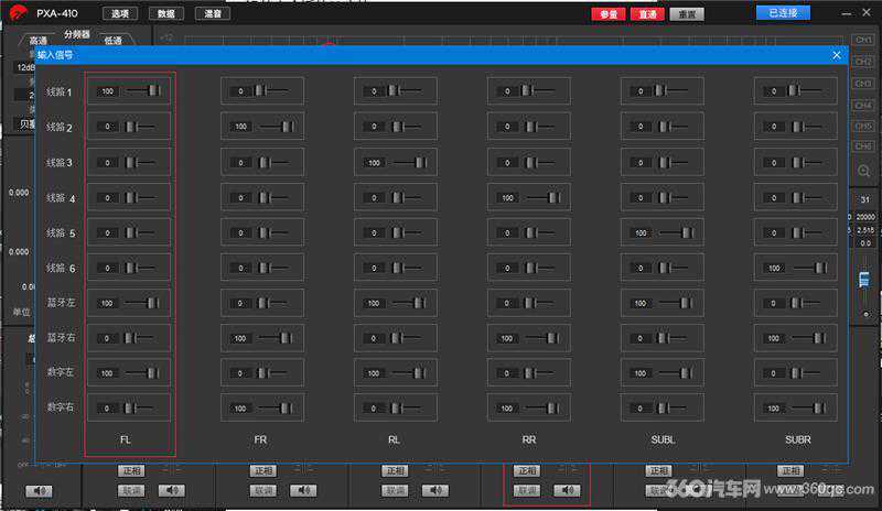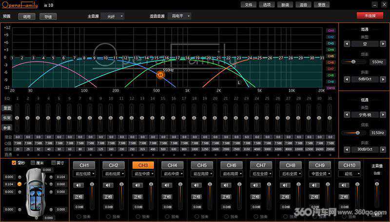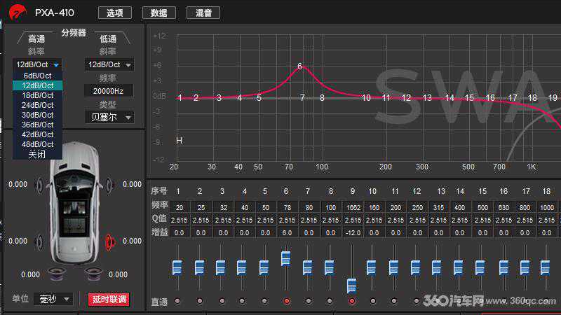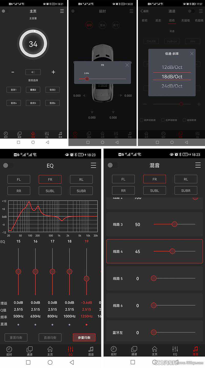 除了电脑调音之外,当选购配套的外置蓝牙模块后还可用手机APP进行调音,有主页、延时、通道、EQ、混音五大界面,以及6大预存场景,操作简单明了易上手,让车主在日常驾驶中,也可根据播放音乐的不同随时调节,非常的方便。