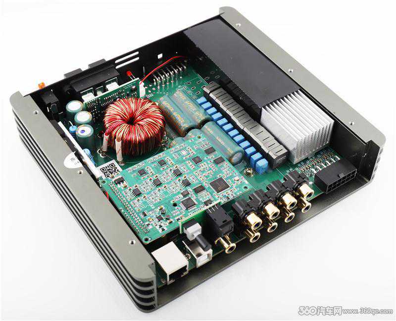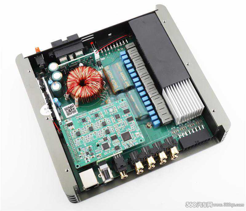 而到底有没有玩虚的,拆机看电路才是见真章的时候。从体积就能知道,PXA采用了高性能的D类电路设计,最为显眼就是电路板上大大的变压器,周边是电容组组成“蓄水池”。尤其是PXA-410,因为有低音声道,更是增多了一只变压器以供低音喇叭的动力需求。为了有更好的分离度,避免功率放大部位和音频处理部分的相互干扰,PXA系列DSP功放采用了双层电路设计,将音频处理部分独立出来,以保证其不高于0.05%的低失真率。