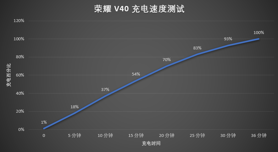 从实际测试结果来看(亮屏状态),利用原装有线充电器,5分钟可以充至18%、10分钟可以充至37%、15分钟可以充至54%、20分钟可以充至70%、30分钟可以充至92%,将4000mAh充至100%大概需要36分钟,和官方给出的标准参考数据基本保持一致,充电速度非常快。
