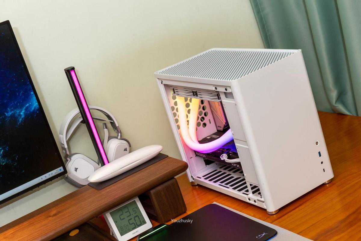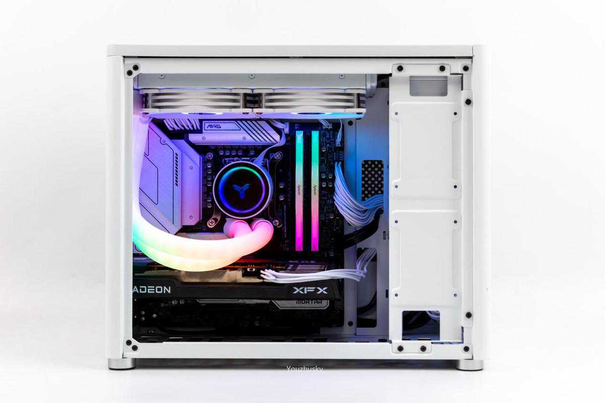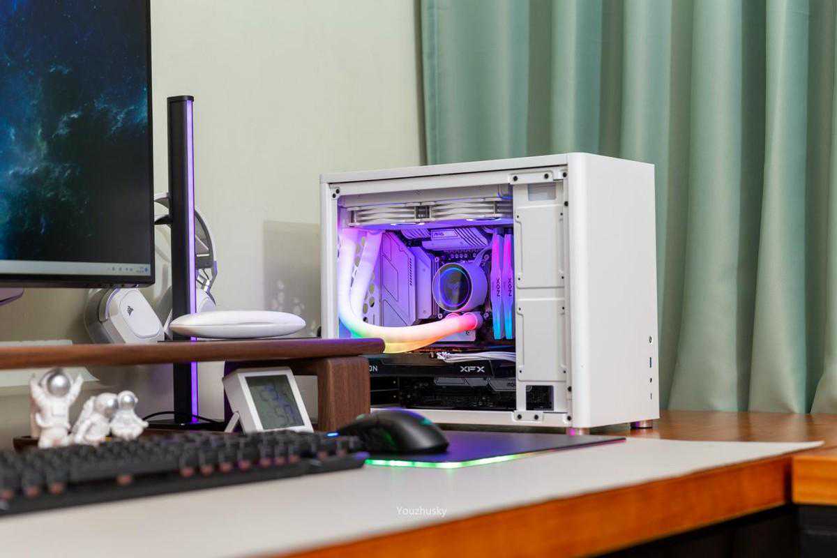 侧面看内部微星B660M迫击炮主板和乔思伯光影240水冷,以及讯景RX6600黑狼显卡