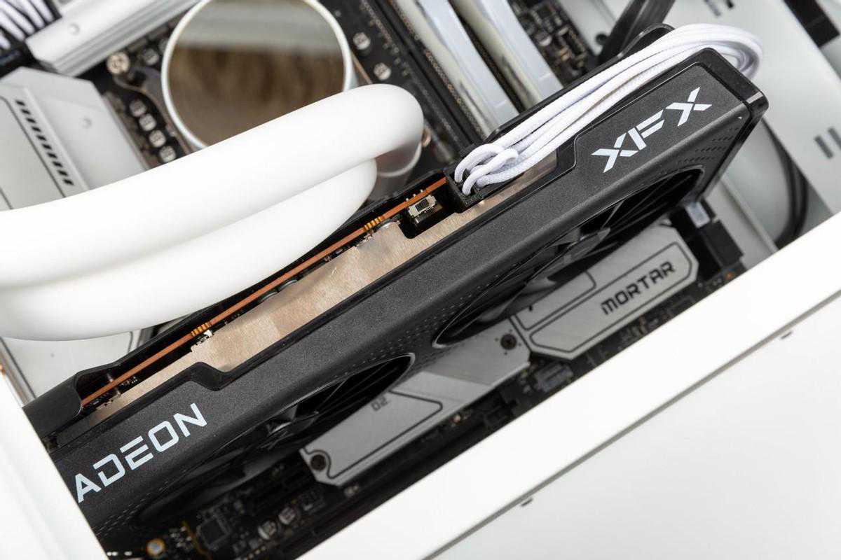 俯视内部,这个角度可以清晰可见讯景RX6600黑狼显卡,以及微星B660M迫击炮的芯片组散热上的MORTARLOGO