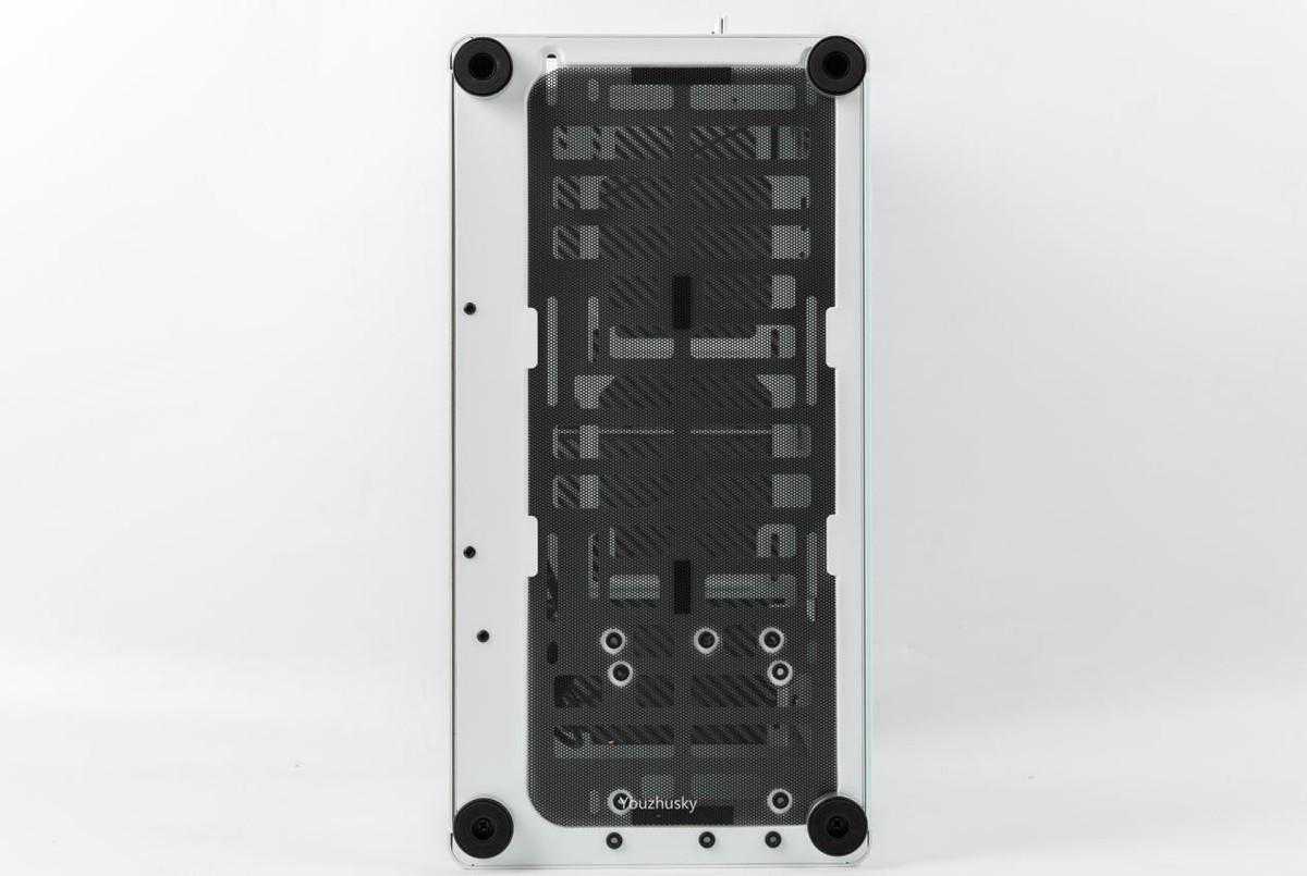 底部四个脚垫并配置有防尘网,垂直风道设计支持3个12CM或2个14CM,前面还有3.5的螺丝孔位