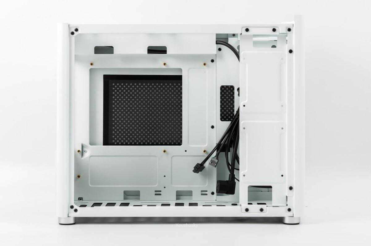 机箱内部空间,24.5的MATX大主板位,上下各有两个穿线孔,电源处也有穿线孔,右边的电源盖板支持2个SSD位