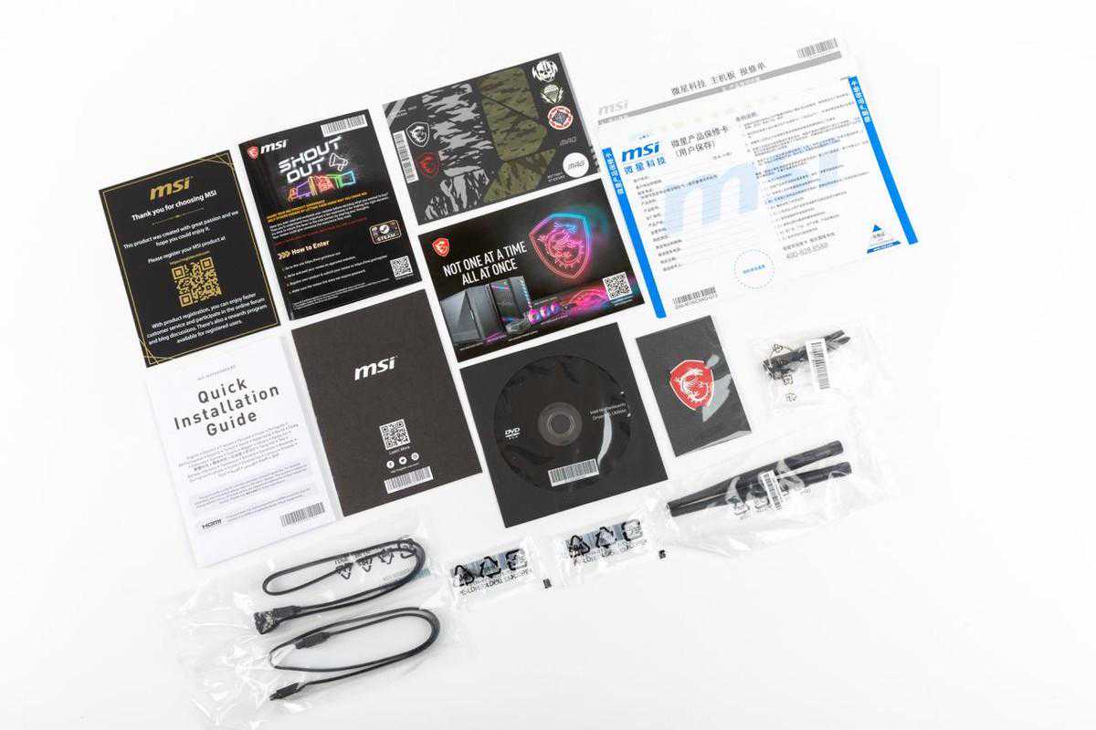 主板内盒配件主要有两条SATA线、两个无螺丝设计的螺丝、两根wifi天线和一把十字一字螺丝刀,其他还有散热贴纸