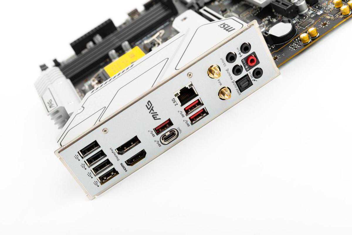 一体化挡板的IO接口配置主要依次为四个,集显的HDMI和DP,三个和一个TYPEC(20Gbps),有线2.5G螃蟹网卡、WIFI6天线接口和音频接口