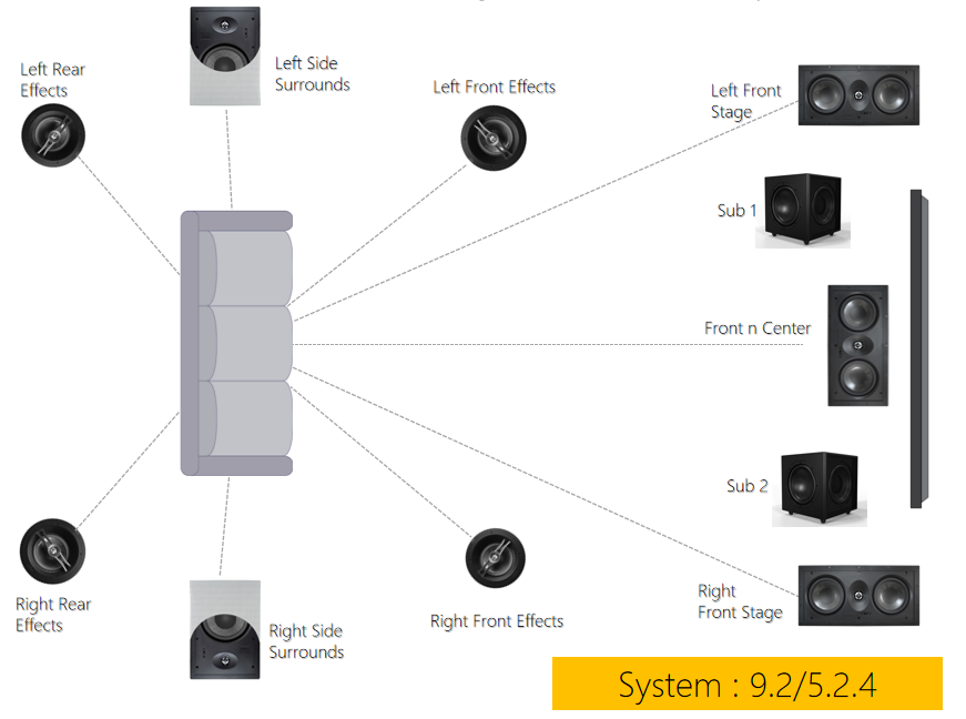 这套OSDAUDIO杜比全景声9.2/5.2.4影院方案中包括了3个T53LCR作为左右前置和中置音箱,2个T83作为左右环绕音箱,4个R63A全景声天花音箱,配以2个TreVoce12EQDSP低音炮。