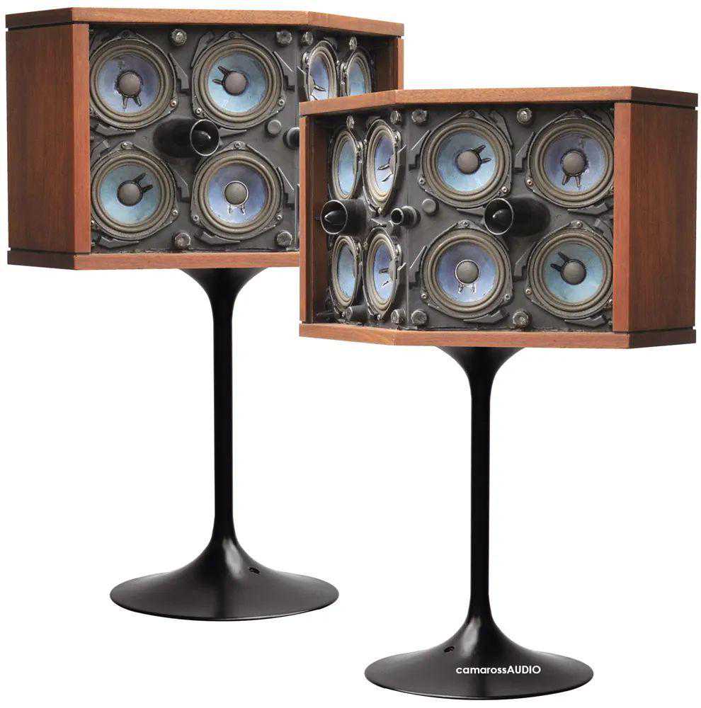 ●号角式音箱典型的高效率大动态音箱系统,能提高喇叭的还原效率,而且失真非常低,但产品的设计十分复杂,不管是圆锥状号角,还是指数型或双曲张号角,其变化的展开尺寸要求都比较精确,如有误差就会出现很大的峰谷,使频率响应变差。背负载号角箱体也要严格设计制作,如背腔体积的容量、滤波器设计不当就会使性能变差。