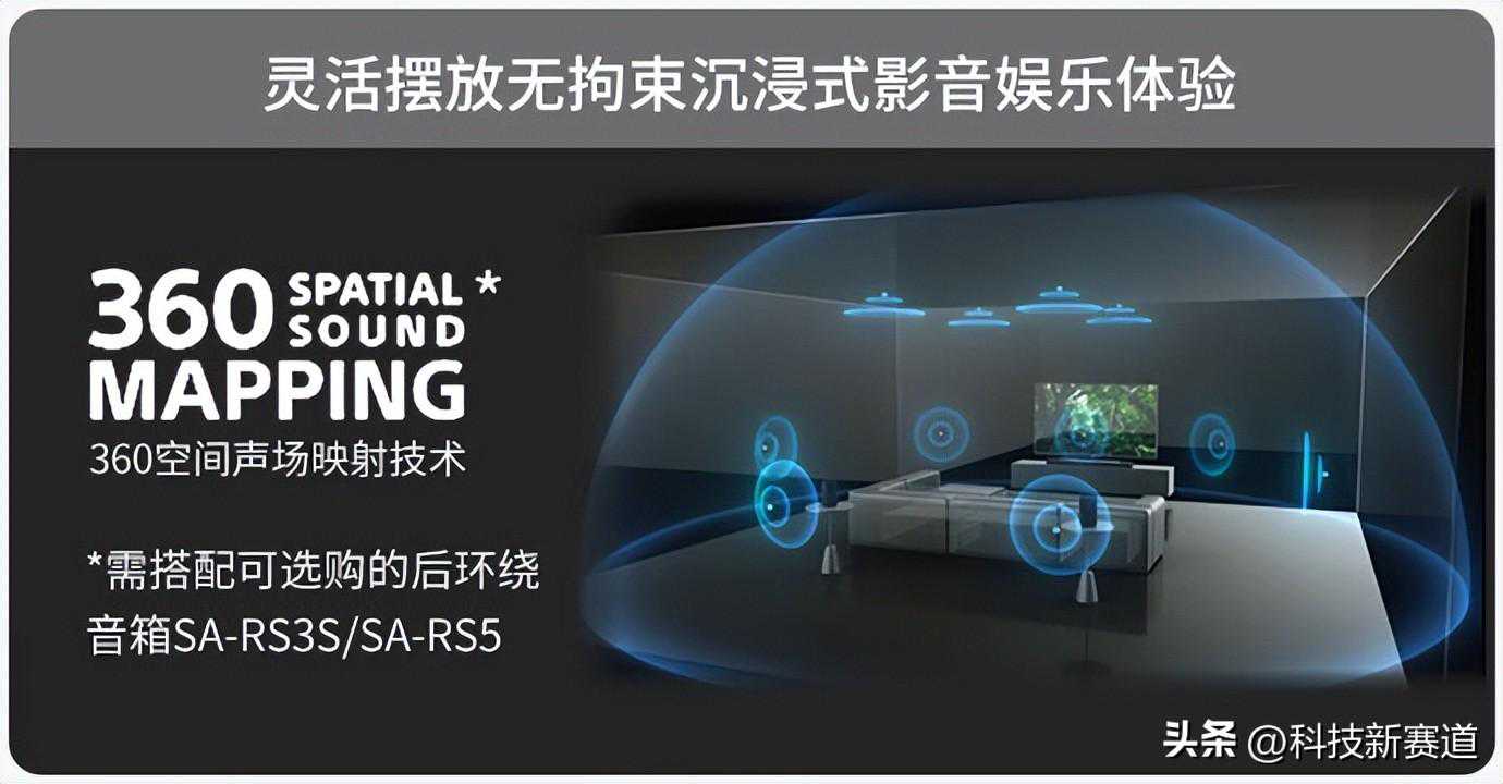 360SSM技术简单来说,就是在索尼测距技术的加持下,音箱之间、音箱和天花板之间,会彼此自动识别距离,然后通过声场优化,生成不同位置的幻象喇叭,营造出穹顶式的实体声场音效,给到观众置身于一个延伸到房间之外的广阔空间。HT-A7000需要搭配后环绕音箱,才可发挥出360SSM技术的作用,相比以往回音壁,它能带来更真实的环绕听感和绝佳的声音氛围。