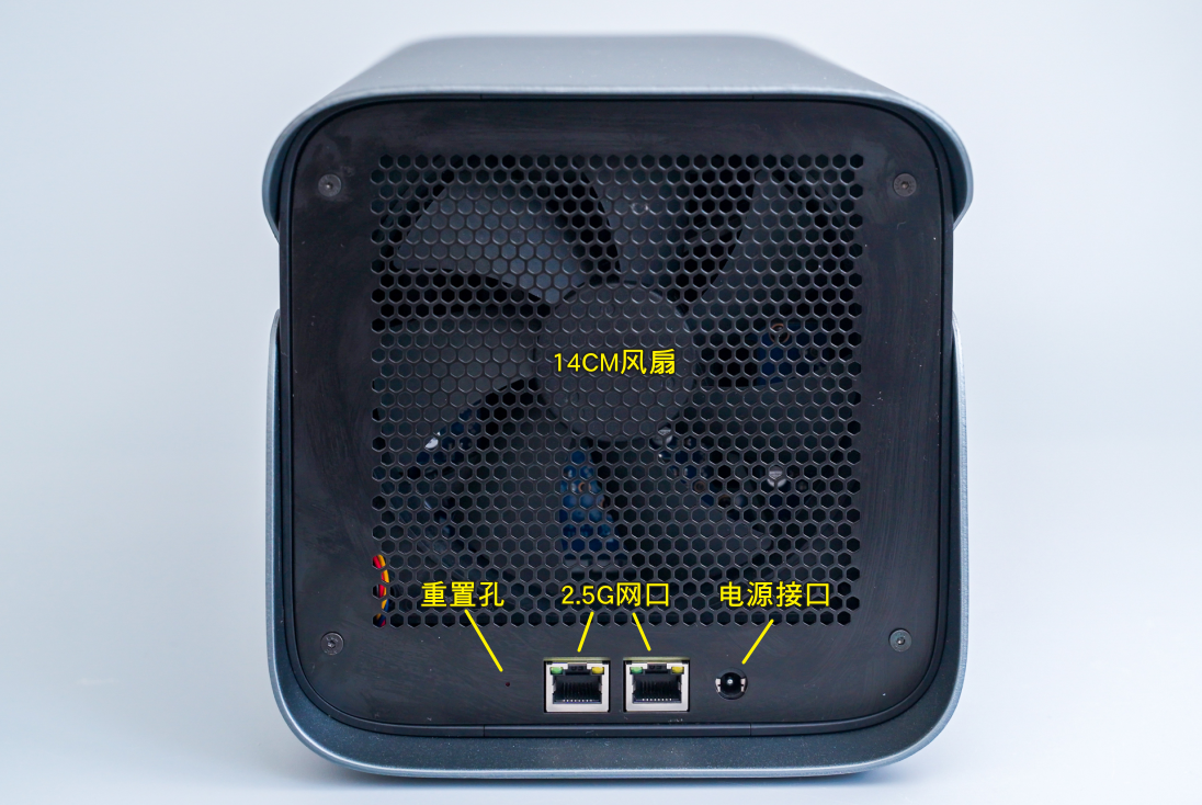 7、背后有一个14CM的散热风扇,以及2个2.5G网口和1个电源接口: