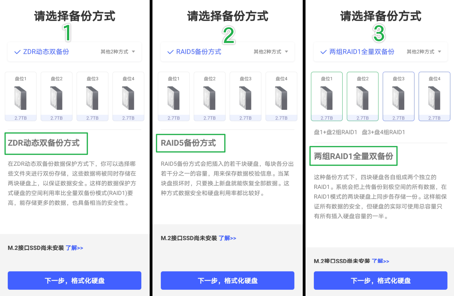 除了常用的RAID5以及RAID1模式,ZDR动态双备份模式,会更节约空间: