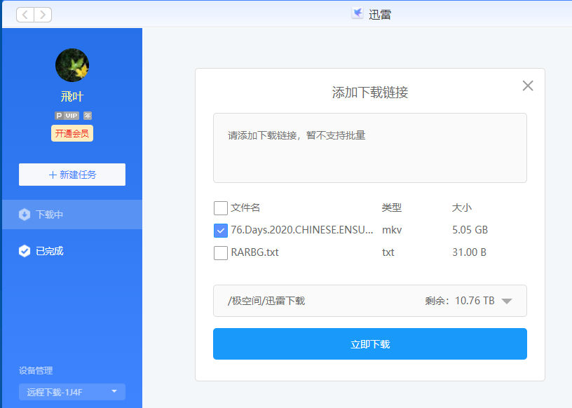 3、用极空间的迅雷,可以远程下载电影到NAS中: