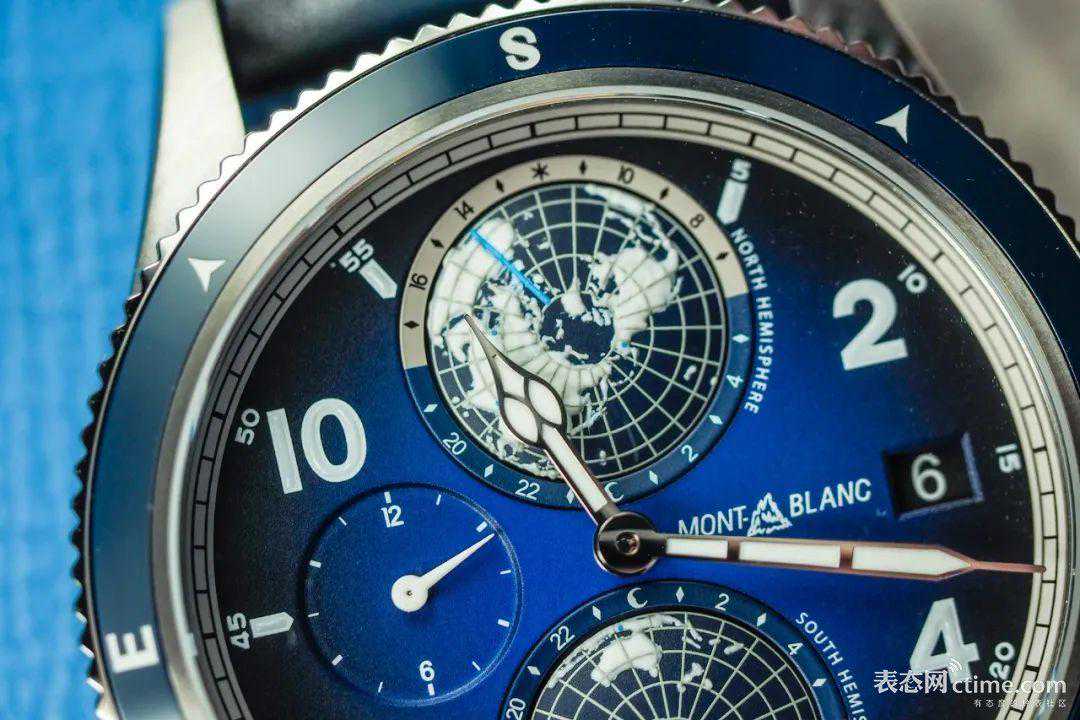 同样的表款,不同的气质。去年温润,今年冷峻,映入眼帘的蓝白色调和即将到来的夏天甚是搭调。表盘的蓝色由内向外渐行渐深,过渡均匀,表盘中的其他元素均采用冰白色,与表盘深邃的蓝色搭配,营造出冷硬、稳重的氛围。而Super-LumiNova涂覆的小时刻度、指针、包括南北半球中的所有大洲,在夜晚会呈现出让人惊叹的视觉效果。